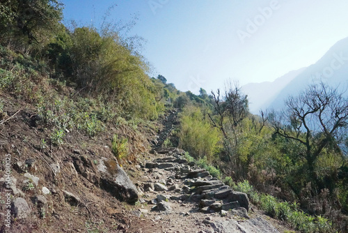 Rocky trail steps with natural landscape of green mountain view- Annapurna Himalayan range, Nepal
