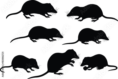 Rodent silhouette vector, mouse and rat poses, walking crouching standing clipart, black animal graphic, isolated wildlife icon set