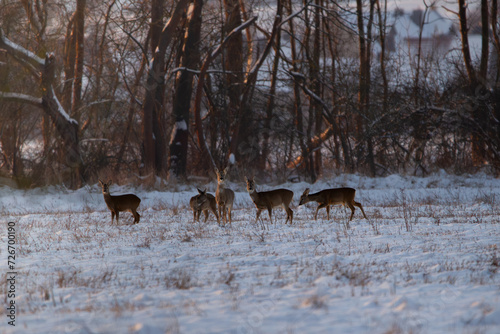 Roe deer, capreolus capreolus, group of deer in winter forest