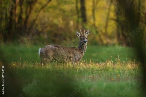 Roe deer male on the magical green grassland, european wildlife, wild animal in the nature habitat, deer rut in czech republic.