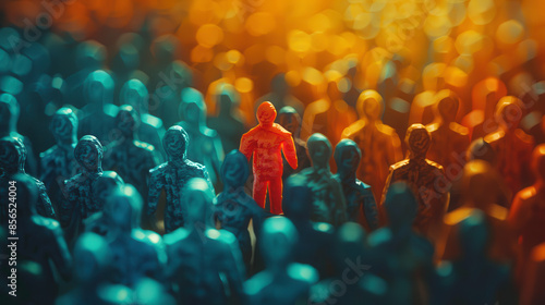 Role model : A red figure stands out among a crowd of gray figures, symbolizing individuality and uniqueness in a homogeneous environment.