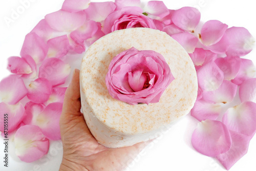 roll of toilet paper with fresh roses and petals on wршеу background, gentle and soft toilet paper with rose fragrance
