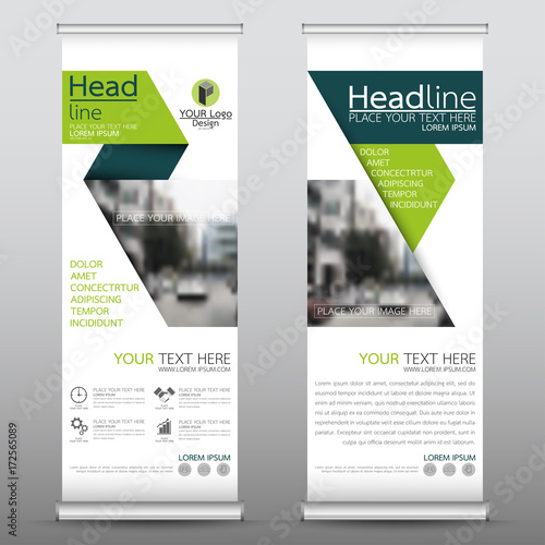 Roll up business banner design vertical template vector, cover presentation abstract geometric background, modern publication display and flag-banner, layout in rectangle size.