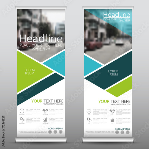 Roll up business banner design vertical template vector, cover presentation abstract geometric background, modern publication display and flag-banner, layout in rectangle size.
