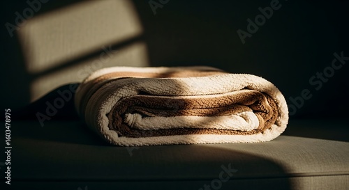 Rolled blanket with stripes, illuminated by sunlight creating shadows on a textured surface.