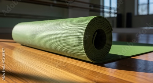 Rolled green yoga mat on glossy wood floor with sunlight