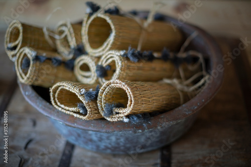 Rolled up rustic straw placemats in bowl