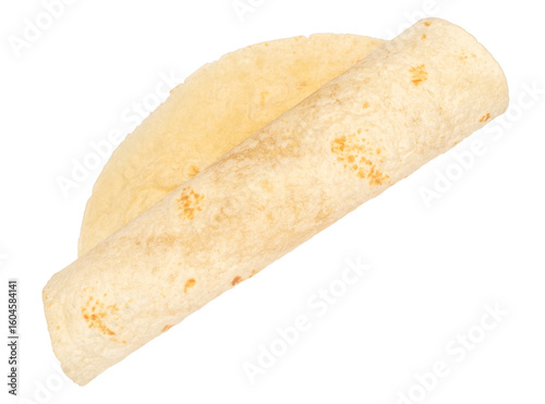 Rolled wheat tortilla on a white background, ideal for wraps and burritos.