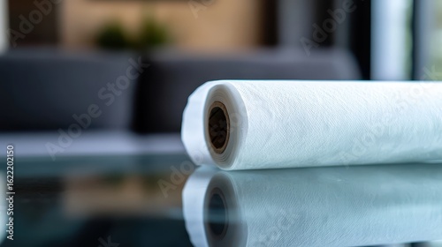 Rolled white fabric material reflecting on a smooth glass surface with a blurred background