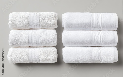 Rolled white towels, stacked vertically in pairs, against a neutral backdrop