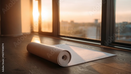 Rolled yoga mat on a wooden floor, sunset view through large windows