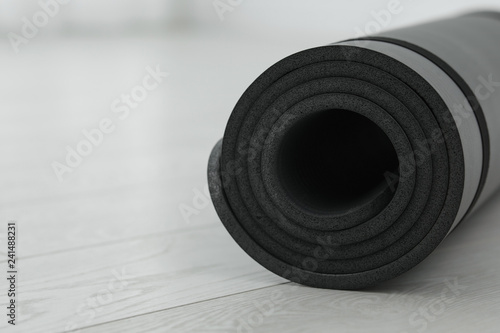 Rolled yoga mat on wooden floor, closeup. Space for text