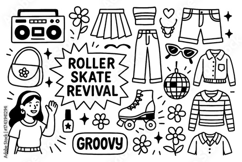 Roller skate revival doodle with groovy outfits and retro fashion elements, Transparent Background