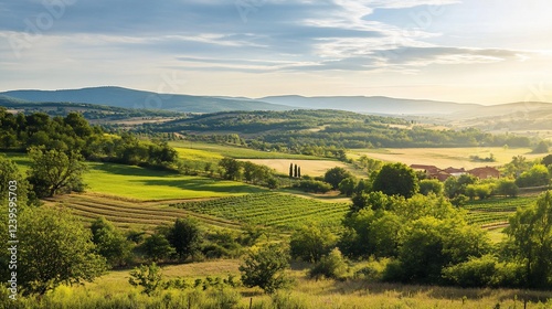 Rolling hills and vineyards at sunrise create a stunning landscape view