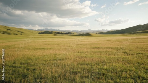 Rolling hills grassland landscape, summer sunlight, scenic view, nature background, travel photography