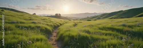 Rolling hills of emerald grass, wildflowers scattered , day, botany, calm