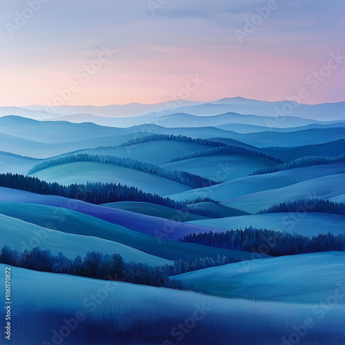 rolling hills under twilight's glow, painted in pastel hues, creating a dreamy, serene landscape