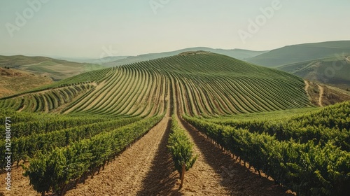 Rolling Vineyard Landscape on Hills with Rows of Grapes and Vines