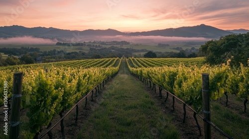 rolling vineyards in the countryside during sunrise, encapsulating rows of dew-kissed, fresh green vines under a pink sky