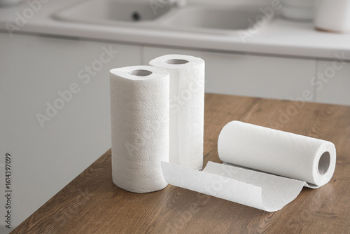 Rolls of paper towels on table in kitchen