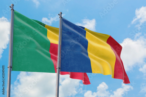 Romania and Benin flags waving in the wind against white cloudy blue sky together. Diplomacy concept, international relations.