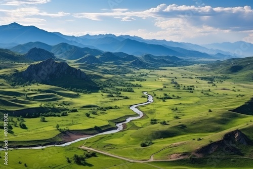 Romania landscape. Tranquil River Winding through Lush Green Mountainous Landscape at Sundown.