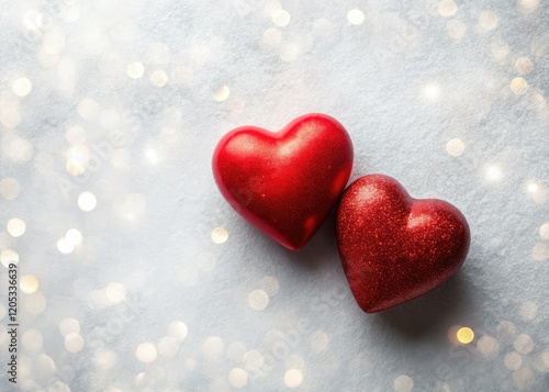 Romantic aerial view of red hearts scattered on a white textured background, perfect for Valentine's Day. Ample copy space.