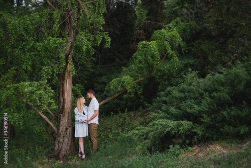 Romantic and happy caucasian couple in casual clothes hugging on the background of beautiful nature. Love, relationships, romance, happiness concept. Man and woman walking outdoors together.