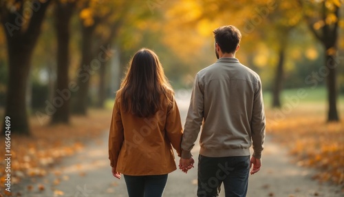 Romantic autumn stroll featuring a couple holding hands while walking together in a scenic park adorned with golden leaves under a peaceful afternoon light