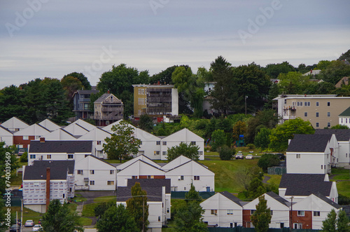 Romantic backstreet, side street or alley in historic old town of Portland, Maine with New England style architecture facades, a landmark sightseeing tourist spot in downtown