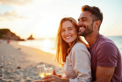 Romantic Beach Sunset Couple Enjoying Wine Moments Together Perfect for Love and Relationship Promotions