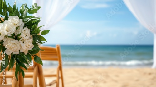 Romantic Beach Wedding Setup with White Flowers and Scenic Ocean Background