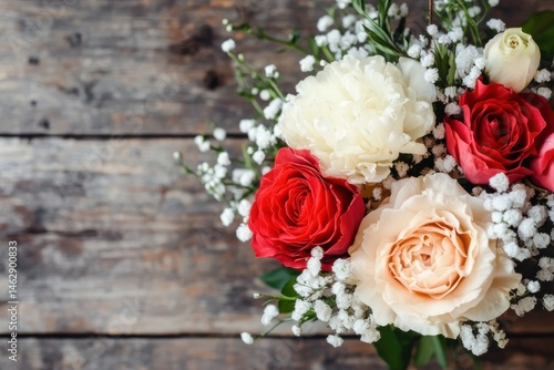 Romantic bouquet of red, white, and peach roses and carnations. Fresh flowers arranged on weathered wood