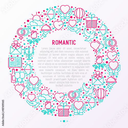 Romantic concept in circle with thin line icons, related to dating, honeymoon, Valentine's day. Modern vector illustration, web page template about Valentine's day.