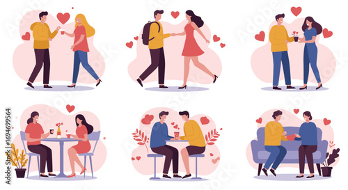 Romantic couple activities collection in vibrant flat style with heart elements