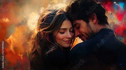 Romantic couple embracing, close-up portrait against a vibrant, abstract background.