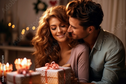 Romantic couple exchanging holiday gifts by candlelight in cozy home. Shallow depth of feld