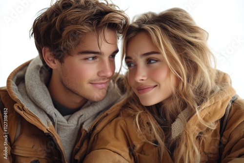 Romantic couple holding hands and gazing at each other, isolated for storytelling and emotional branding.