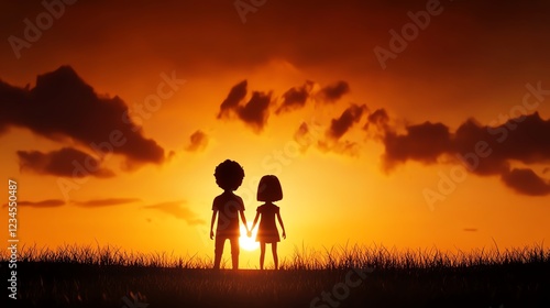Romantic couple holding hands at sunset, warm golden glow, 3D illustration