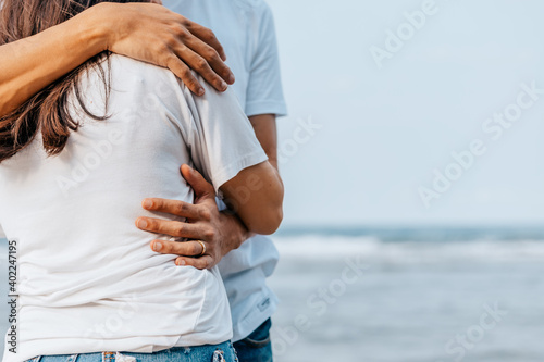 romantic couple hug together on the beach at summer. Honeymoon, travel, holiday, summer concept.