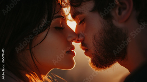 Romantic couple leaning in for a kiss, captured in soft golden sunset light with an intimate and tender atmosphere, perfect for illustrating love and connection. for wedding or engagement themes.