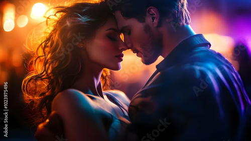 Romantic couple sharing an intimate moment in a vibrant setting.
