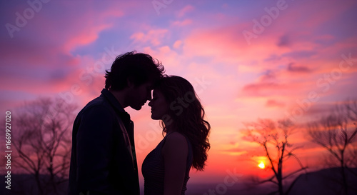 Romantic couple silhouetted against a vibrant sunset sky