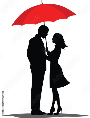Romantic couple standing under a red umbrella, silhouette vector illustration