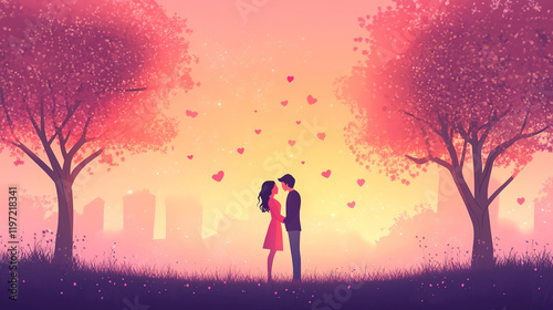 romantic couple stands in dreamy landscape surrounded by pink trees and hearts