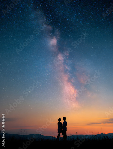 Romantic Couple Stargazing Under Vibrant Milky Way Galaxy at Sunset, Intimate Connection and Wonderful Travel Experience for Millennials
