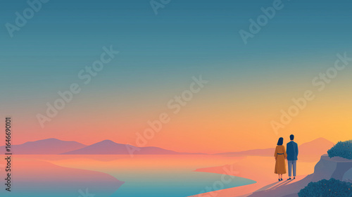 Romantic Couple Watching Sunset by the Ocean with Minimalist Landscape