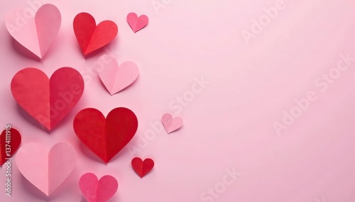 Romantic design featuring pink and red paper hearts on soft pink background, romance, anniversary