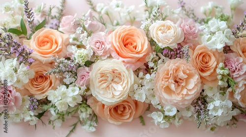 Romantic floral arrangement features soft peach and pink roses, lavender sprigs, and white flowers against pastel pink, creating dreamy wedding vibes with airy focus.