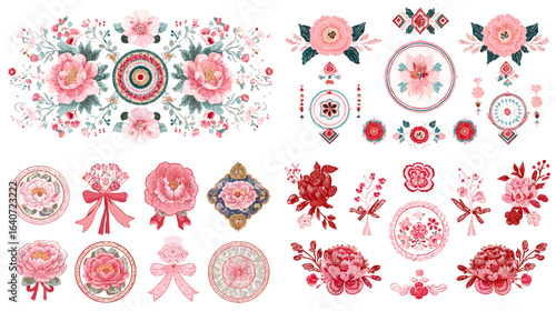 Romantic floral decorative ornaments with roses, ribbons, and circular frames in pink and red tones, perfect for invitations, packaging, and crafts.